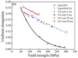 基于该模型,研究者进一步调控梯度层的厚度分数和粗晶层的晶粒尺寸,预测了不同梯度微结构下的单拉力学响应,给出了强度和韧性的分布图。模拟结果表明梯度纳米晶粒材料的强度—韧性分布呈现出近似线性关系,与实验揭示的规律一致。