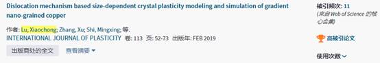 《International Journal of Plasticity》由世界上最大的科技出版商荷兰Elsevier公司主办,是固体力学特别是塑性力学领域的TOP期刊之一,2019年最新公布的影响因子为5.8,中科院JCR一区。ESI全称Essential Science Indicator,根据论文对应领域和出版年中的高引用阈值,将引用次数排在其学术领域中最优秀前1%之列的论文评为高被引论文。