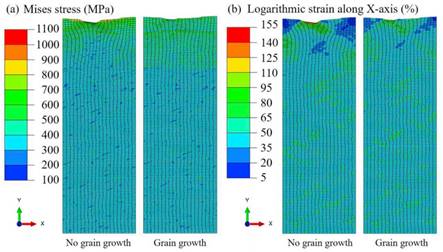 图1 考虑和不考虑晶粒长大机制的应力云图和应变云图