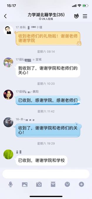 自疫情爆发以后,学院始终关心、关注着每一名湖北籍学子的情况,学院党政班子专题研究关心关爱湖北籍学生的工作,学院副书记第一时间电话联系每一位湖北籍同学,关心了解同学们及家人生活情况;各年级辅导员也利用电话、微信和QQ与他们保持密切联系和良好沟通,并组建了湖北籍学生QQ群,确保了解在鄂学子的健康状况、心理状态,让学生知道学院是他们的坚强后盾。