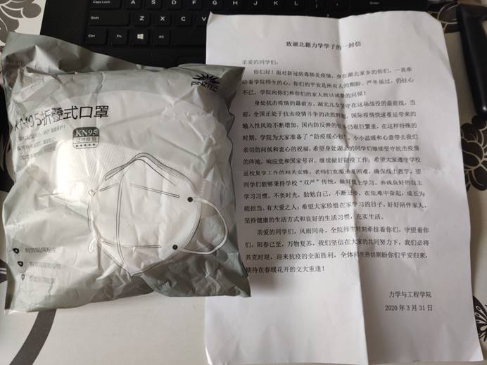 4月1日,学院为30名湖北籍学生寄送“防疫暖心包”,包裹里不仅有防疫物品,还有一封写给湖北学子们的信。在信中,学院向湖北同学致以诚挚的问候,表达了浓浓的思念与牵挂,让他们感受到了来自学院的温暖,给了大家战胜疫情的勇气和信心。
