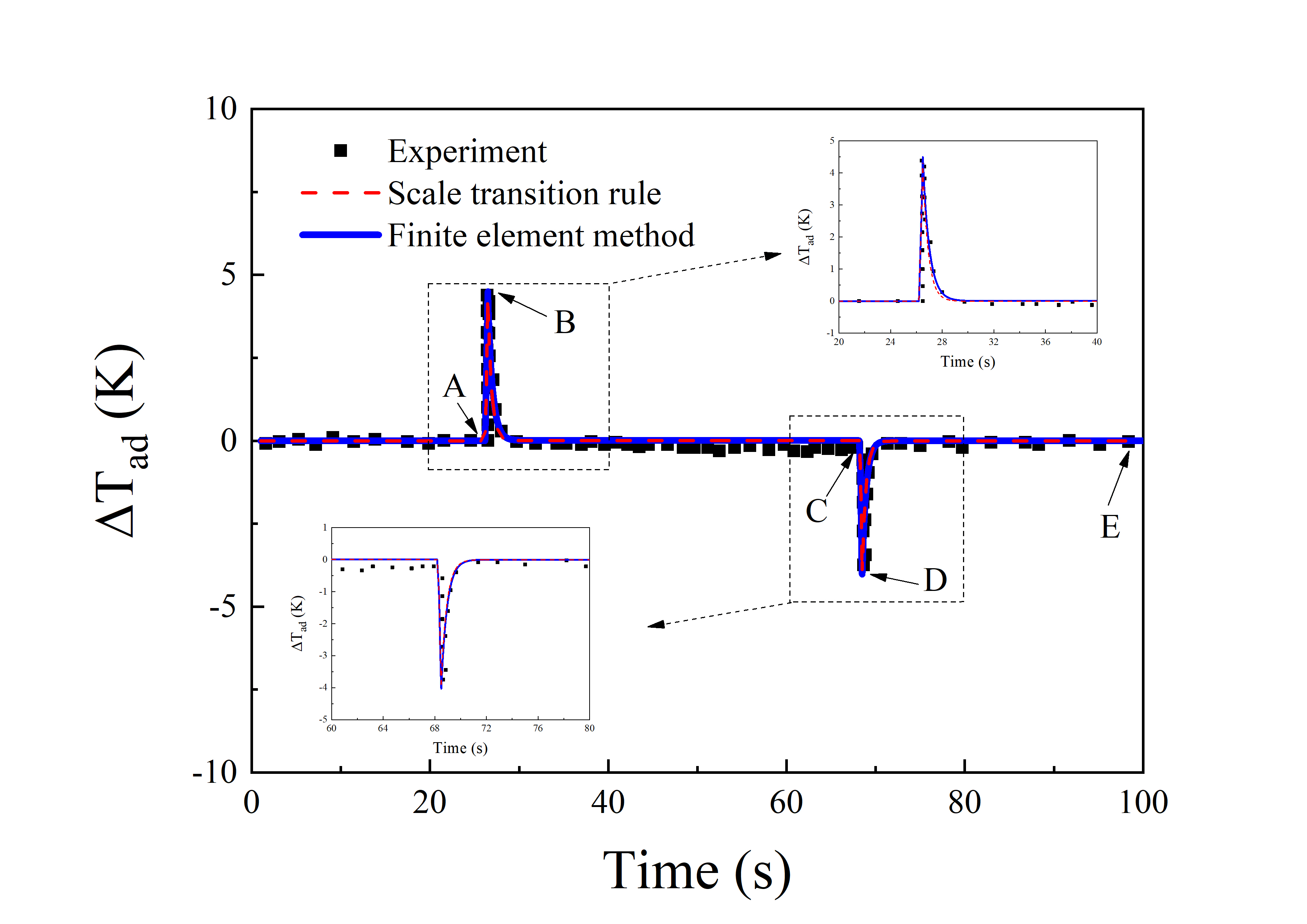 2020年8月6日,康国政教授团队在金属材料学顶级期刊《Acta Materialia》上发表论文“Modeling the two-way shape memory and elastocaloric effects of bamboo-grained oligocrystalline shape memory alloy microwire”。形状记忆合金通过适当的“机械训练”,可激发相变诱发塑性这一非弹性变形机制,进而产生位错内应力。这样,在内应力对马氏体变体选择的作用下,材料可以同时记忆住其“高温”和“低温”两种形态,并在变温过程中实现两种形态的相互转变,即“双程形状记忆效应”。同时,形状记忆合金应力和温度诱发固态相变过程中伴随着相变潜热的释放和吸收,使其显示出独特的“弹卡效应”。基于以上两种效应,形状记忆合金可用作温度驱动器和固态制冷设备的核心元器件,因而备受瞩目。