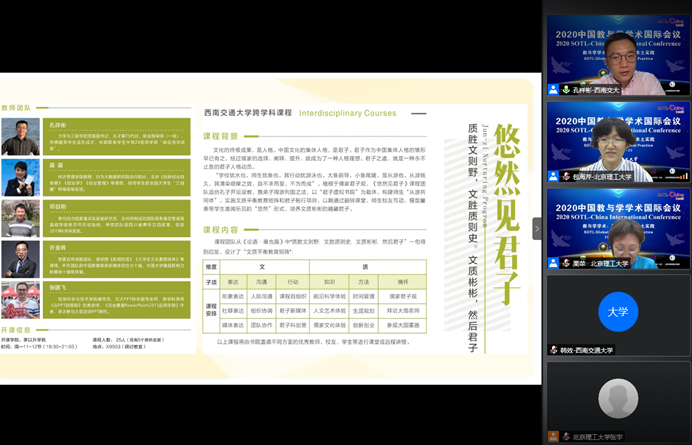 在第4分论坛,力学学院孔祥彬老师作为负责人主持召开了“多维学术、全人教育、学生自组织与团队共创式学习”研讨会。研讨会上,力学学院孔祥彬、人文学院朱洁、材料学院黄兴民、电气学院刘东分享了基于多维学术观和全人教育理念的以学生为中心的教育教学模式,探讨了教师引领下的学生自主学习自组织与团队共创式学习模式对学习共享空间建构和学习共同体形成的促进作用,江苏师范大学熊岚副教授进行了精彩点评。孔祥彬老师的发言题目为“通识课《悠然见君子》的共享空间打造与从游育人”。研讨会特别邀请了《悠然见君子》第七期班长、素人AV