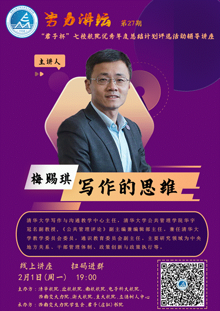 2021年2月1日晚7点,为倡导和鼓励学生养成自省与规划的好习惯,配合“君子杯”七校航院大学生优秀年度总结计划评选活动,力学学院党委副书记孔祥彬老师特邀清华大学写作与沟通教学中心主任梅赐琪副教授做客努力讲坛分享“写作的思维”,来自素人AV