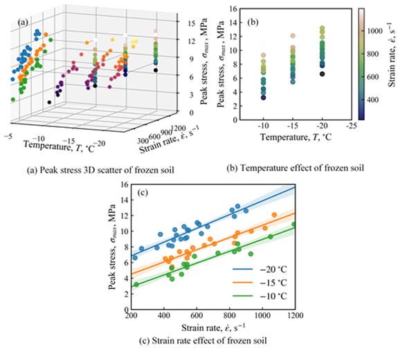 冻土由于其内部的土、冰、水等成分,其冲击动态力学性能受到应变率、温度、冰-水相变等因素的影响。在冲击加载条件下,冲击变形时间远小于热扩散时间,导致绝热条件占主导地位。此时,由于剧烈的塑性变形产生的热量集中在局部区域,导致冰-水相变,润滑裂纹面,加速冻土的破坏。绝热温升作为冻土冲击变形的重要机制,鲜有考虑冻土绝热温升影响的冲击动态本构模型报道。同时,针对冻土冲击加载条件下表现出的应变率效应及温度效应,学界多为对应变率效应和温度效应进行单独报道,两者之间深层次的联系尚缺乏系统的研究。